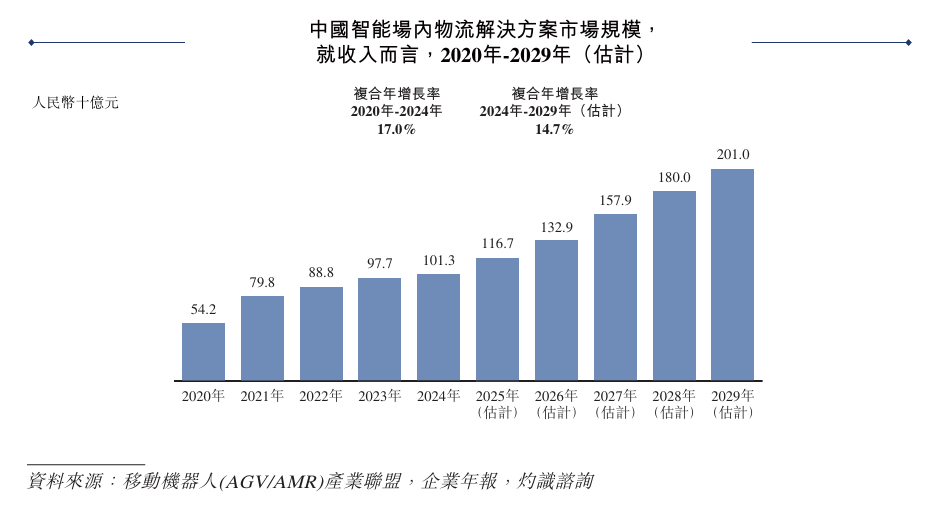 根據灼識諮詢數據,全球智能場內物流解決方案市場規模從2020年的3,008億元增長至2024年的4,711億元,複合年增長率達11.9%。目前,其全球滲透率約爲20%,擁有巨大的增長潛力。在多種因素的綜合驅動下,全球智能場內物流解決方案市場未來預計仍將保持良好的增長勢頭,並於2029年突破8,000億元。