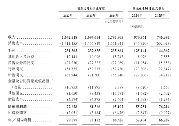 2022年至2024年淨利潤分別爲7057.7萬元、7818.2萬元、8862.2萬元,對應毛利率爲14.1%、14%、13.1%;2024年與2025年截至6月30日六個月淨利潤分別5240.4萬元、6628.7萬元,對應毛利率爲12.9%、19.3%。
