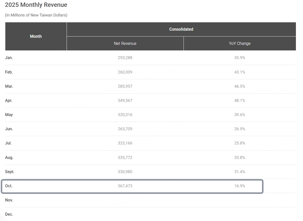 據彭博社,臺積電10月銷量同比增長16.9%,爲2024年2月以來最低增速。分析師平均預期本季度營收將增長16%。