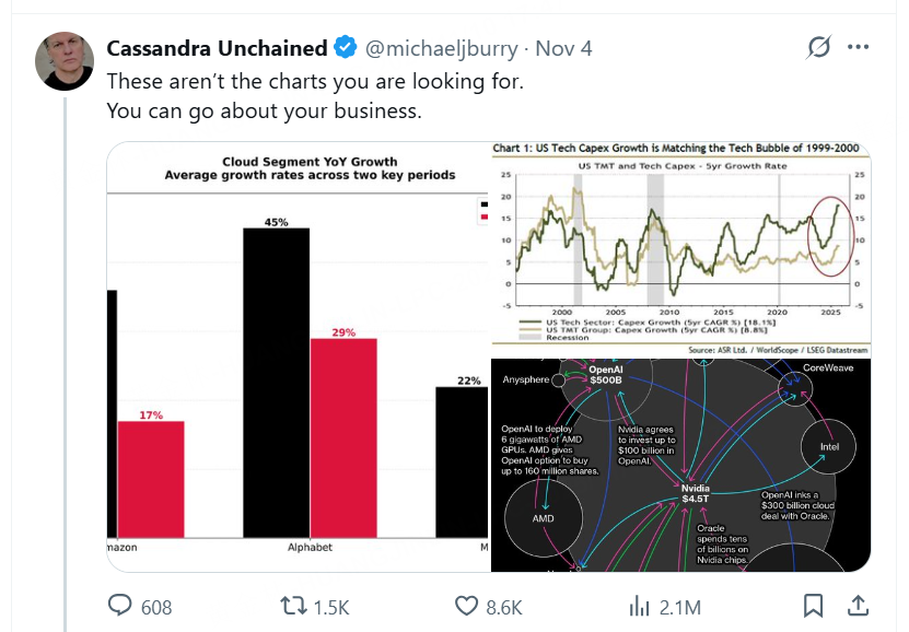 11月4日,《大空頭》原型人物邁克爾·伯裏(Michael Burry)在X平臺發佈看空AI巨頭的帖子,暗示AI基礎設施投資(如數據中心)類似2000年互聯網泡沫:科技巨頭數百億美元CapEx(資本支出)可能閒置,若需求放緩,估值將崩盤。