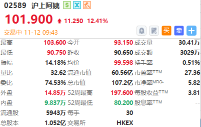 華盛資訊11月12日訊,港股新消費概念開盤狂飆!截至發稿,滬上阿姨漲超12%,鍋圈、毛戈平漲超5%,奈雪的茶漲超4%,蜜雪集團、茶百道漲超3%。