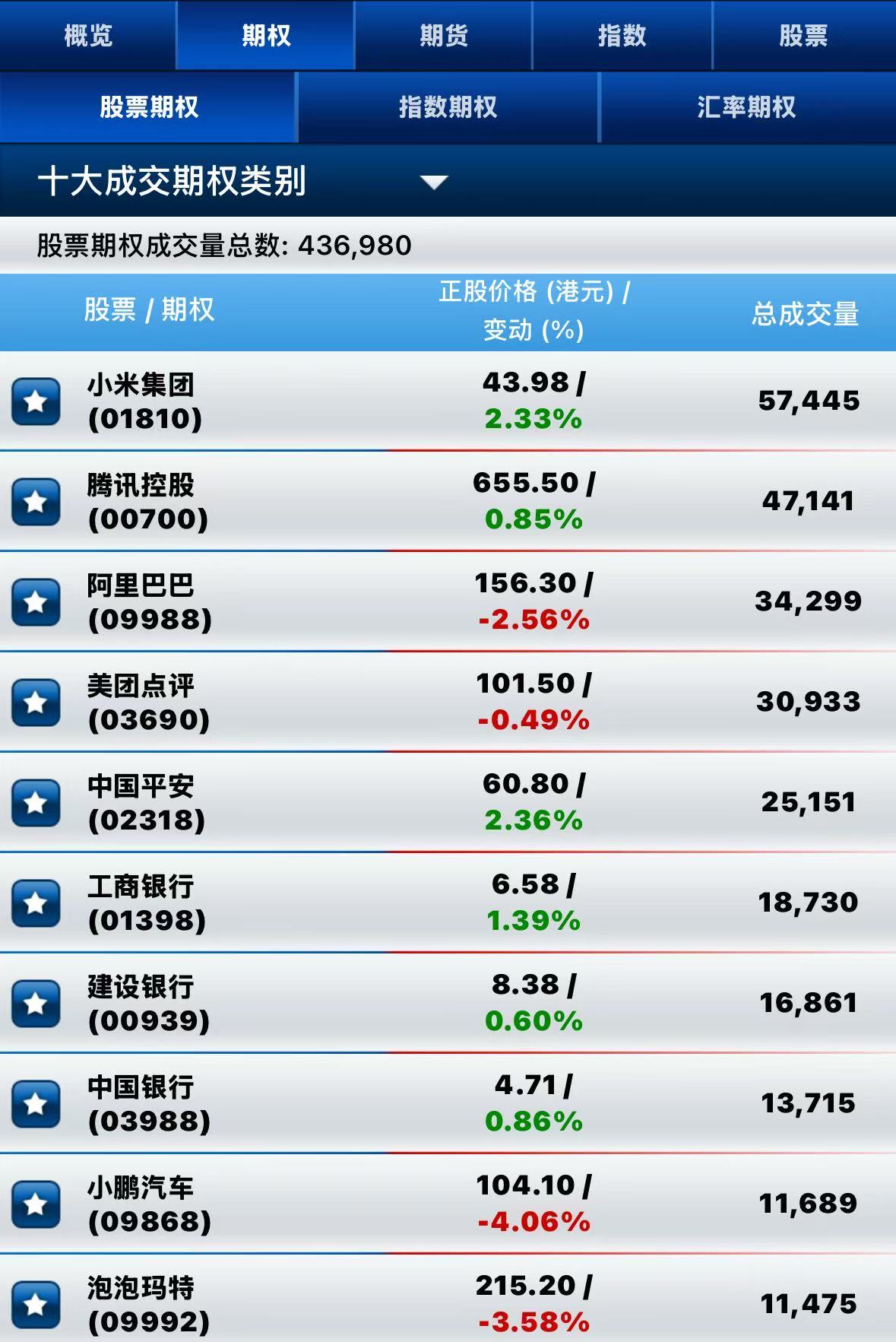 截止午間收盤,港股期權半日成交近43.7萬張。其中,小米集團-W成交量居前,期權成交超5.7萬張;騰訊控股名列次席,期權成交超.7萬4張;阿里巴巴-W位居第三,期權成交超3.4萬張。