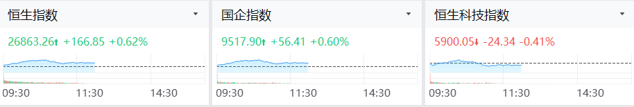 11月12日,港股三大指數漲跌不一,截止午間收盤,恒生指數漲0.63%,恒生科技指數跌0.41%, 國企指數漲0.60%。