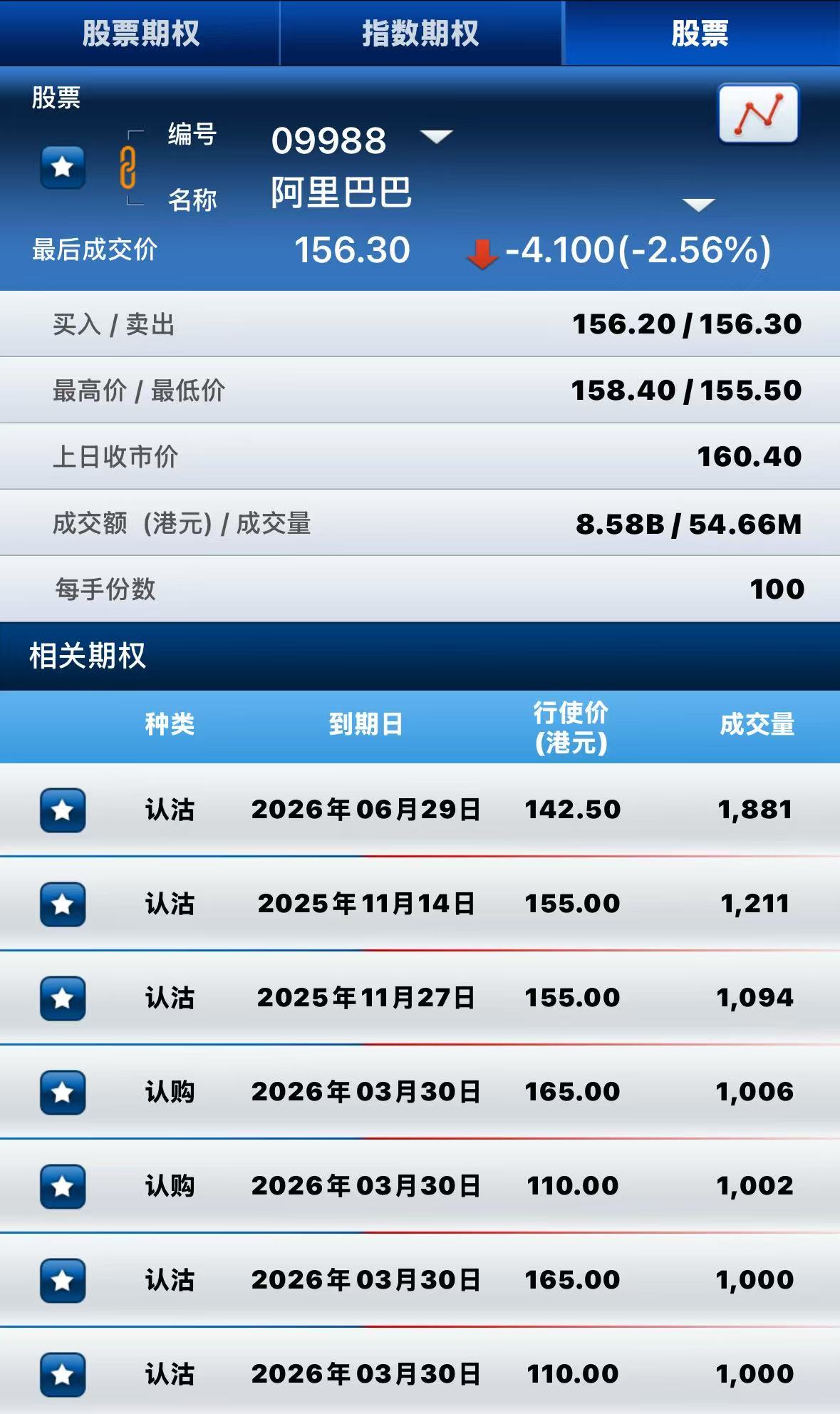 阿里巴巴-W跌超2%,期權方面:半日成交超3.4萬張合約,其中於2026年6月29日到期行權價142.5港元的認沽期權成交量居前,成交近1900張合約。 $ALB.HK 20260629 142.50 PUT$