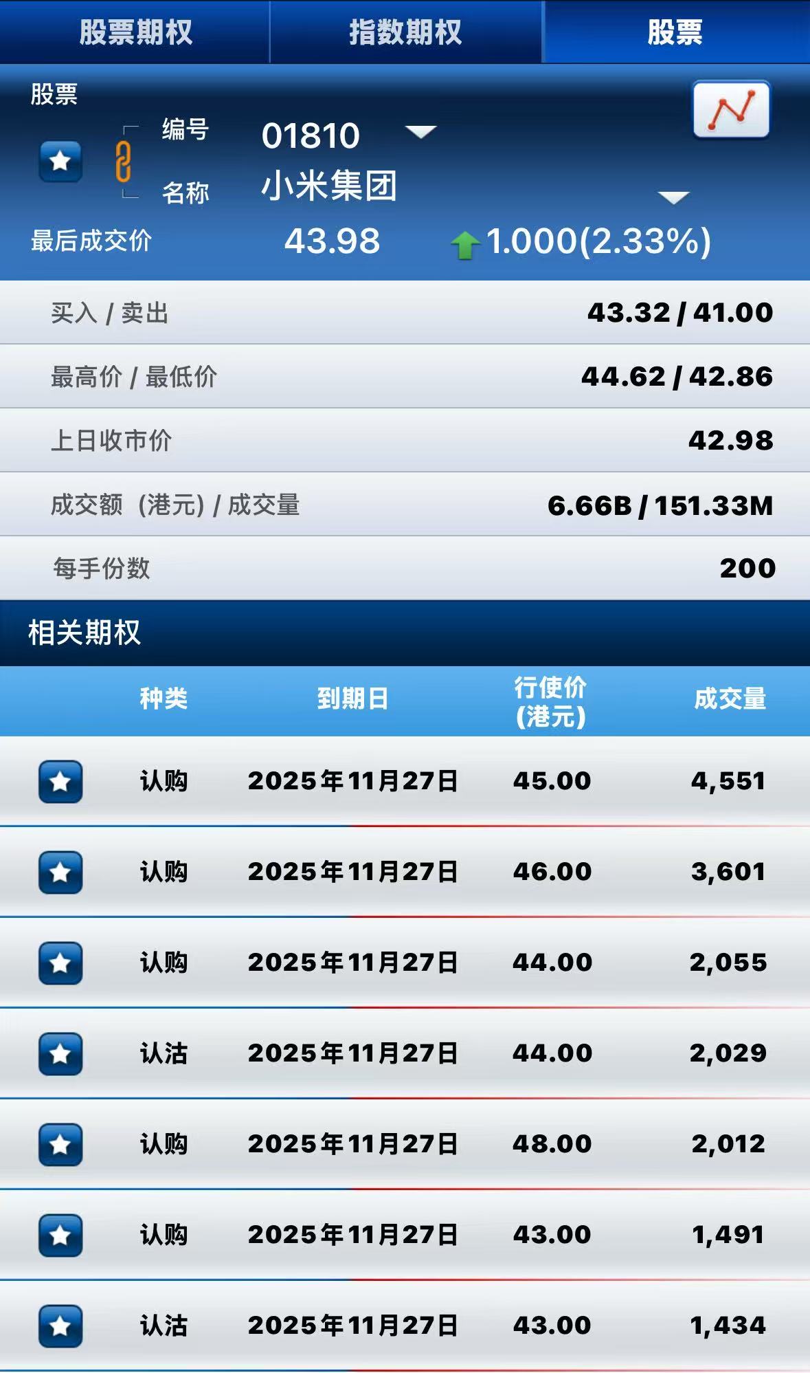 雙十一全渠道累計支付金額破290億元,小米集團-W漲超2%!期權方面:半日成交超5.7萬張合約,其中於2025年11月27日到期行權價45港元的認購期權成交量居前,成交超4500張合約。 $MIU.HK 20251127 45.00 CALL$