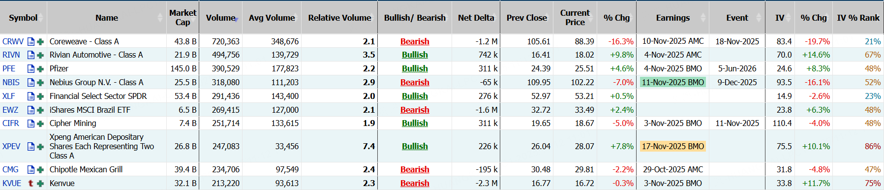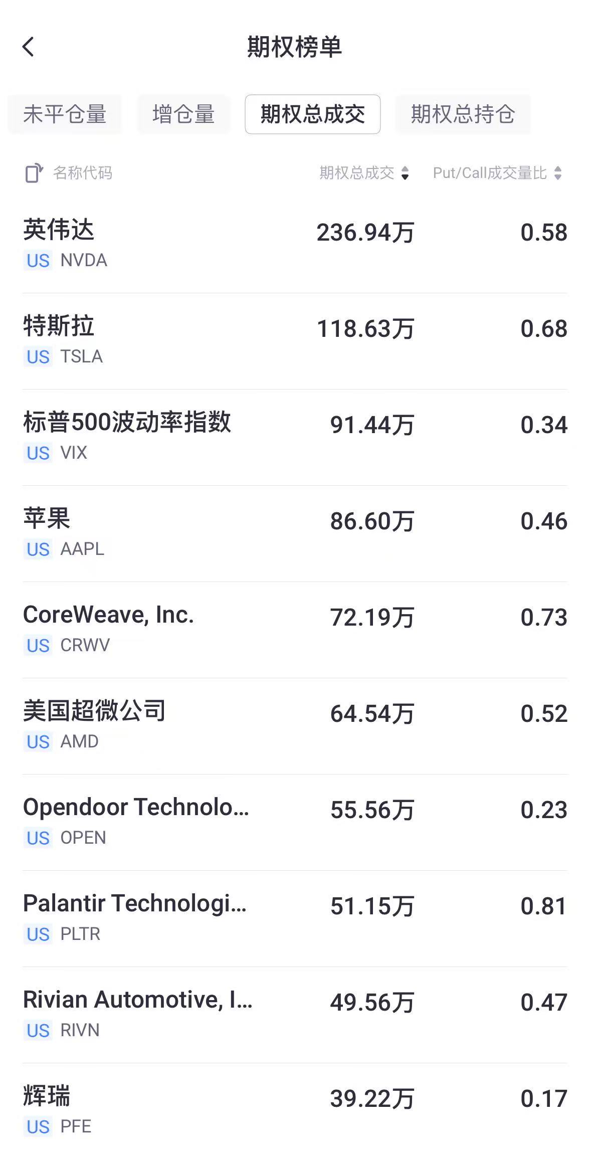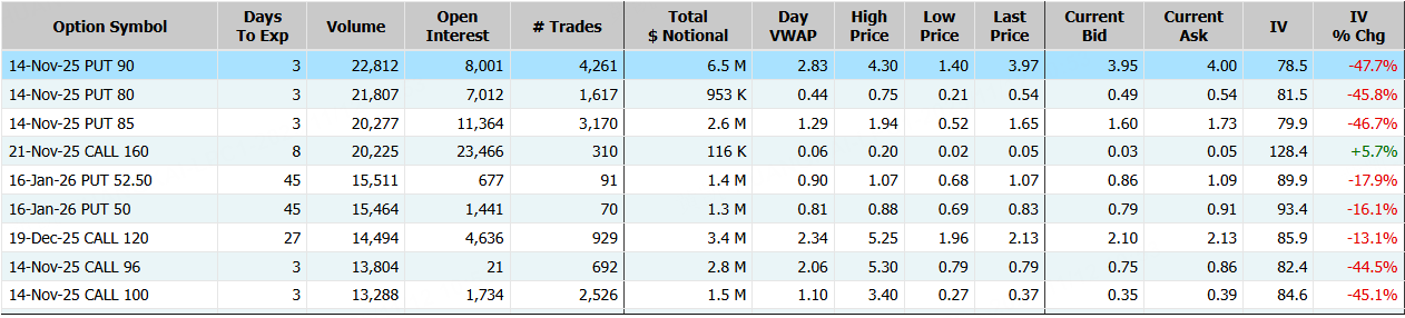 AI基礎設施提供商CoreWeave隔夜收跌16%,期權合約成交72.19萬張,較90日均量放大2.1倍。11月14日到期的90美元的行權看跌期權交易量特別高,共有22,812份合約交易。 $CRWV 20251114 90.0 PUT$