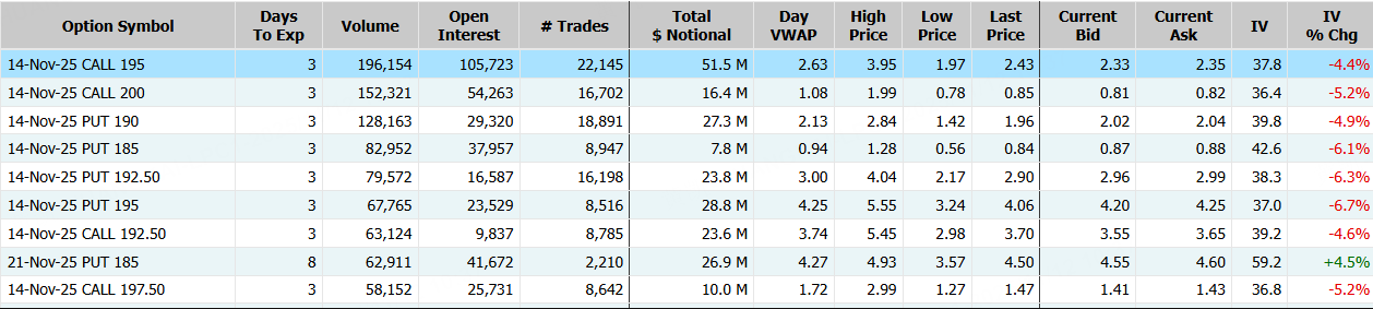 英偉達隔夜跌近3%,期權合約成交236.94萬張。11月14日到期的195美元的行權看漲期權交易量特別高,共有196,154份合約交易。 $NVDA 20251114 195.0 CALL$