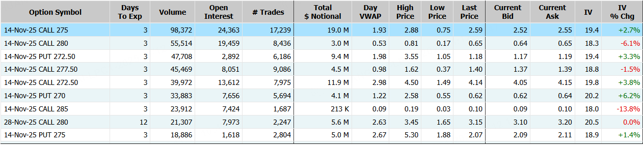 蘋果隔夜漲超2%,期權合約成交86.6萬張。11月14日到期的275美元的行權看漲期權交易量特別高,共有98,372份合約交易。 $AAPL 20251114 275.0 CALL$