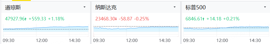 美東時間週二,美股三大股指收盤漲跌不一。截至收盤,道指漲559.33點,漲幅爲1.18%,報47927.96點;納指跌58.87點,跌幅爲0.25%,報23468.30點;標普500指數漲14.18點,漲幅爲0.21%,報6846.61點。