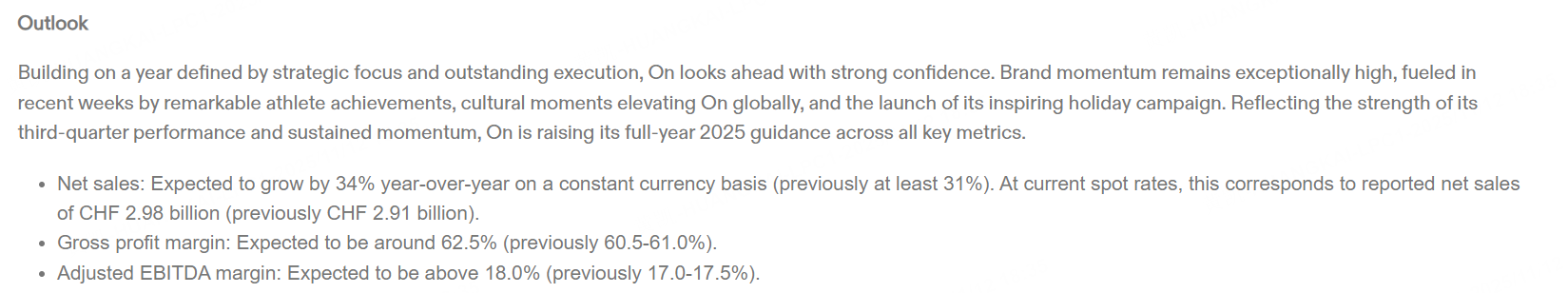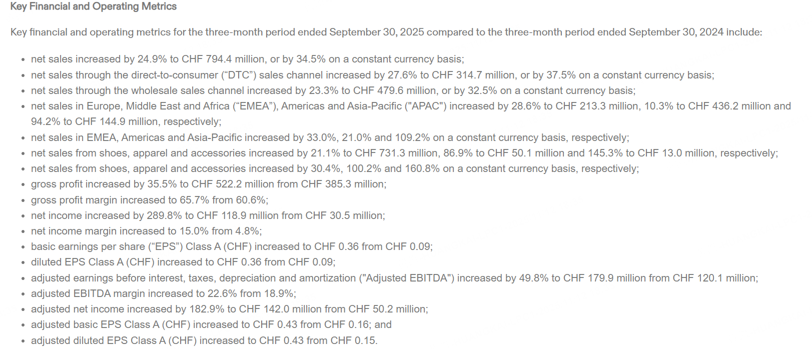 11月12日,瑞士運動品牌On Holding發佈了2025財年第三季度財報。報告顯示,On第三季度銷售額爲7.944億瑞士法郎,同比增長24.9%,超過分析師預期的7.268億瑞士法郎。