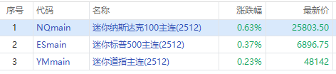 美國衆議院今日投票臨近,或有望結束歷史上最長政府停擺;美股三大期指盤前集體走高,截至發稿,納指期貨 $NQmain 漲0.63%,標普500期貨 $ESmain 漲0.37%,道指期貨 $YMmain 漲0.23%。