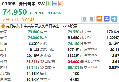華盛資訊11月13日訊,港股騰訊音樂-SW績後大跌超11%,報74.95港元,成交額近1.3億港元。