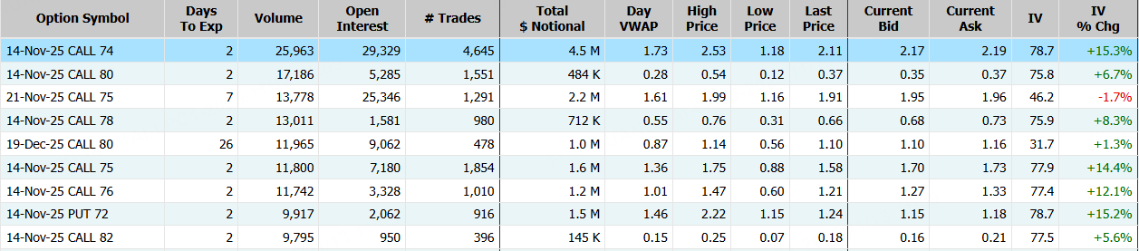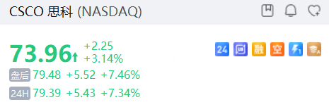 思科隔夜漲超3%,盤後續漲超7%。期權合約成交35.4萬張,較90日均量放大6.2倍。11月14日到期的74美元的行權看漲期權交易量特別高,共有25,963份合約交易。 $CSCO 20251114 74.0 CALL$
