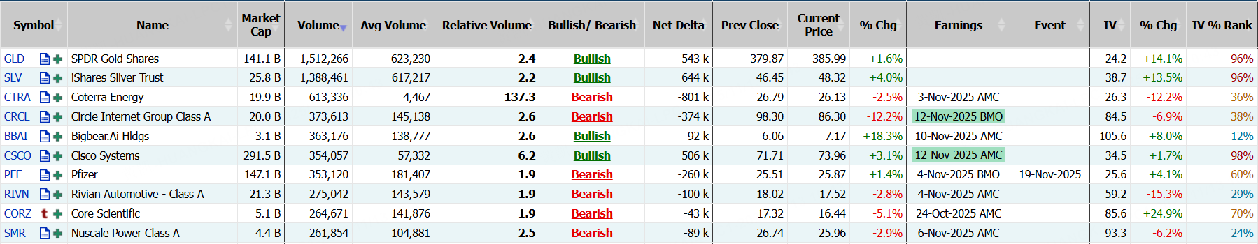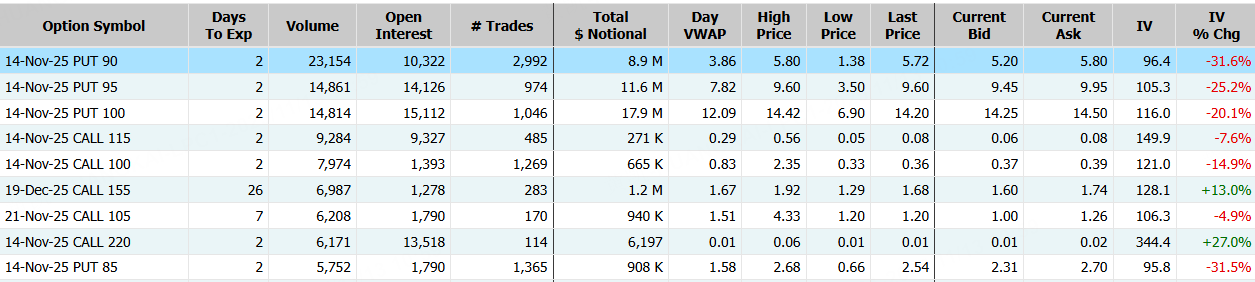 穩定幣發行商Circle隔夜跌超12%,期權合約成交37.36萬張,較90日均量放大2.6倍。11月14日到期的90美元的行權看跌期權交易量特別高,共有23,154份合約交易。 $CRCL 20251114 90.0 PUT$