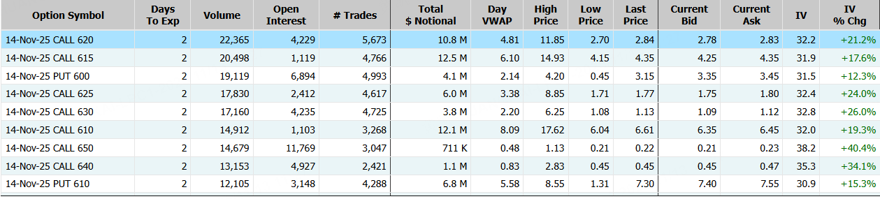 Meta Platforms隔夜跌近3%,期權合約成交73.44萬張。11月14日到期的620美元的行權看漲期權交易量特別高,共有22,365份合約交易。 $META 20251114 620.0 CALL$