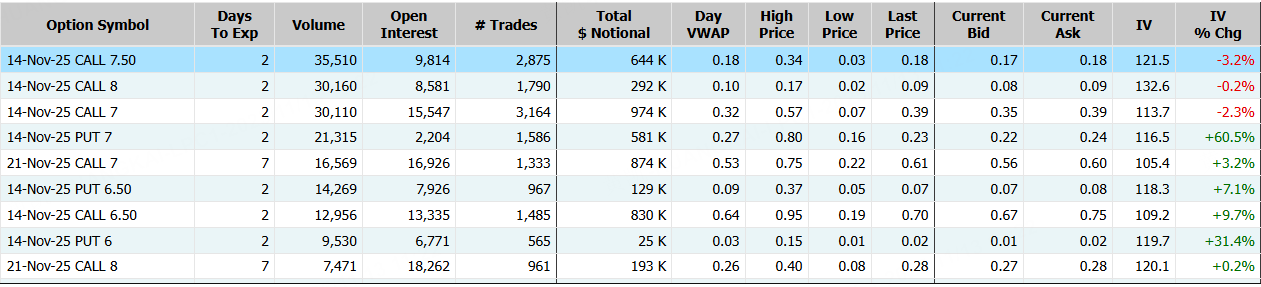 BigBear.ai隔夜漲超18%,期權合約成交36.32萬張,較90日均量放大2.6倍。11月14日到期的7.5美元的行權看漲期權交易量特別高,共有35,510份合約交易。 $BBAI 20251114 7.5 CALL$