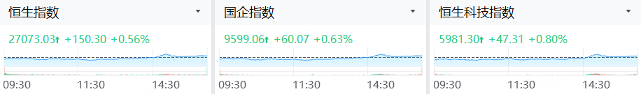港股三大指數齊漲, 恒生指數漲0.56%,恒生科技指數漲0.80%,國企指數漲0.63%。