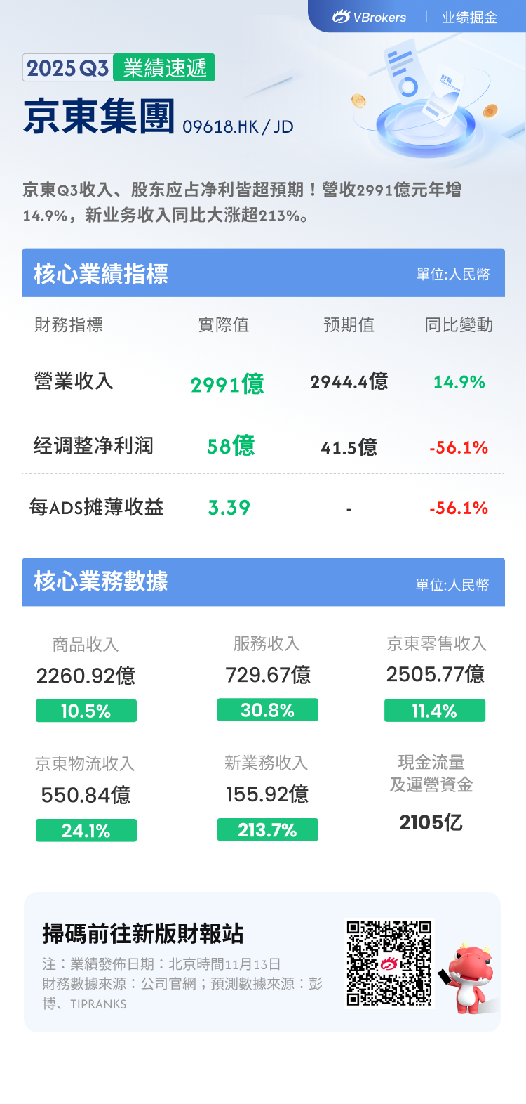 華盛資訊11月13日消息,京東 $JD / $09618.HK 公佈截至2025年9月30日止的第三季度業績。截至發稿,京東美股盤前漲超3%。