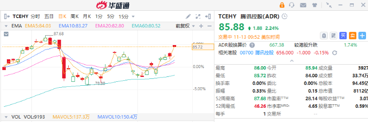 華盛資訊11月7日訊,美股早盤低開低走,納指跌幅擴大至1%,熱門中概股漲跌不一騰訊控股(ADR)( $TCEHY )盤漲超2%,公司Q3營收、淨利全面超預期。