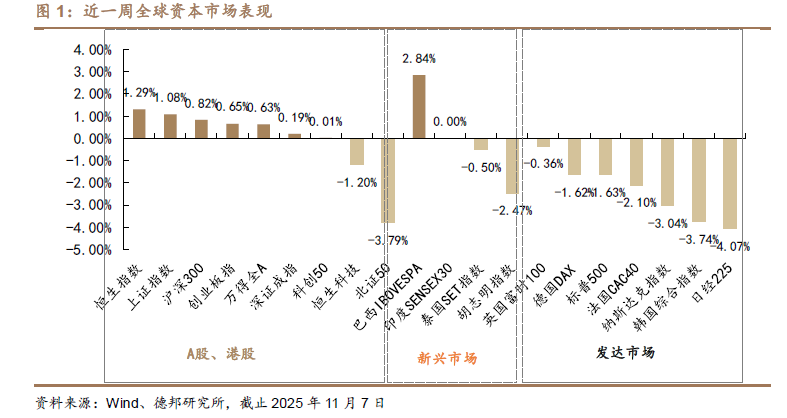 海外市場方面:美國政府持續停擺,美聯儲內部對 12 月降息分歧有所上升,本週美股三大指數全面回調,標普 500 指數下跌 1.63%、納斯達克綜合指數下跌3.04%、道瓊斯工業指數下跌 1.21%。歐洲市場方面,本週英國富時 100 下跌0.36%、德國 DAX 下跌 1.62%、法國 CAC40 下跌 2.10%。新興市場表現分化,胡志明指數下跌 2.47%、泰國 SET 指數下跌 0.50%、巴西 IBOVESPA 指數上漲2.84%。