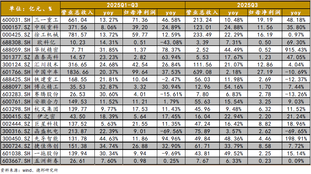 三季度高端製造板塊整體延續了“收入改善、盈利分化”的格局。從營收端看,多數企業保持正增長,說明下游裝備更新、產業升級和部分新興需求仍在支撐景氣度,工程裝備、工業自動化、軌交等方向韌性較強,龍頭企業憑藉訂單與渠道優勢仍能實現規模擴張。但從利潤端看,表現就不完全一致了:部分企業歸母淨利潤增速好於收入,反映出成本管控、產品結構優化正在見效;也有個別企業利潤增速明顯低於收入,甚至出現同比下滑,主要與高基數、訂單結構變化以及階段性費用投入等因素有關,說明盈利修復仍是當前行業的核心約束。