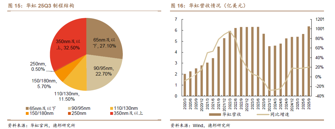 華虹 25Q3 營收 6.4 億美元,同比增長 20.7%、環比增長 12.2%,位於先前指引 6.2-6.4 億美元的上線;毛利率爲 13.5%,高於先前指引的 10%-12%;產能利用率 109.5%,相較 2025Q2 提升 1.2pcts。從製程來看,華虹 65nm 及以下營收佔比爲 27%,90nm/95nm 營收佔比分別爲 23%。華虹 25Q3 的總產能達到 46.8萬片等效 8 寸,Q3 資本開支爲 2.6 億美元。公司預計 25Q4 營收 6.5-6.6 億美元,毛利率爲 12%-14%。