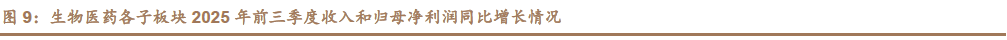 生物醫藥 15 個細分子版塊中,醫療研發外包(CXO),其他生物製品、其他醫療服務板塊 2025 前三季度保持收入同比正增長,其中 CXO 恢復最明顯。其餘板塊受到集採、支付政策、行業週期等影響,業績受到影響。