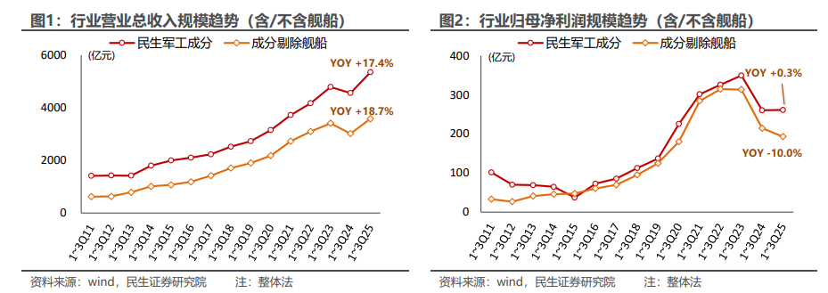 援引民生證券統計數據顯示,前三季度民生軍工成分(不含艦船領域)實現營業總收入3578億元,同比增長18.7%;歸母淨利潤193億元,同比下滑10.0%。若將艦船板塊納入統計範圍,則營業總收入達到5346億元,同比增長17.4%;歸母淨利潤261億元,同比增長0.3%。