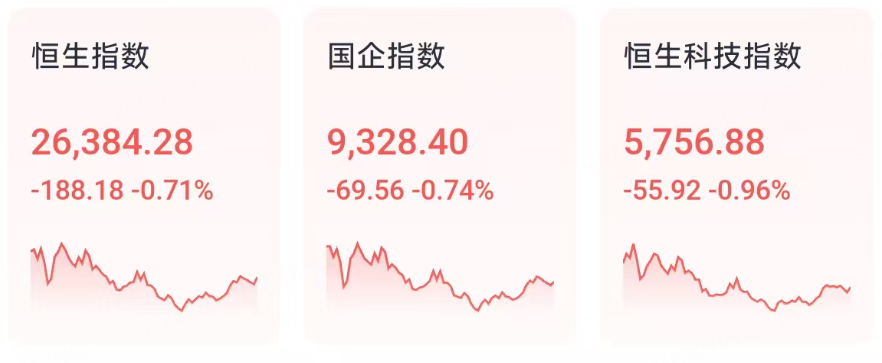 11月17日週一,港股三大指數全天表現弱勢。截至收盤,恒生指數跌0.71%報26384點,國企指數跌跌0.74%報9328點,恒生科技指數跌0.96%報5756點。