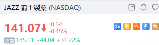 生物醫藥公司 Jazz Pharmaceuticals(JAZZ)盤前飆逾30%,至 185美元;公司表示,其藥物 Ziihera 聯合化療用於治療一種胃癌的晚期研究中,已達到主要研究目標。