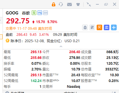 華盛資訊11月17日訊,谷歌漲幅擴大至近6%,股價再創歷史新高,市值突破3.5萬億美元!Q3獲巴菲特首次買入,躋身伯克希爾第十大重倉股>>