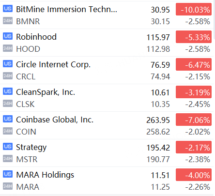 11月18日,美股加密貨幣概念股夜盤走弱,Bitmine Immersion、Robinhood、Strategy、Coinbase、Circle齊齊跌超2%。