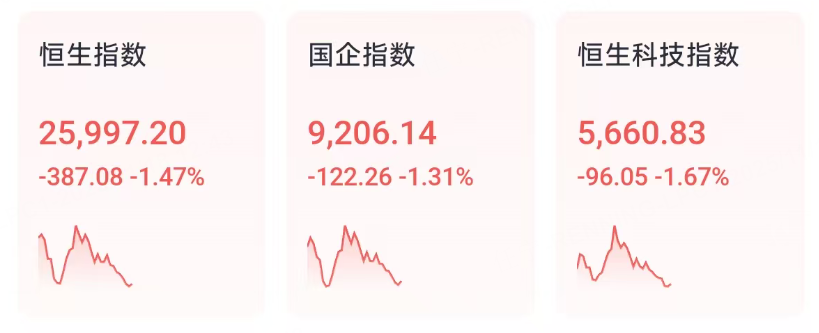11月18日週二,港股三大指數上午走低,恒生指數跌1.47%失守26000點,國企指數、恒生科技指數分別下跌1.31%及1.67%。