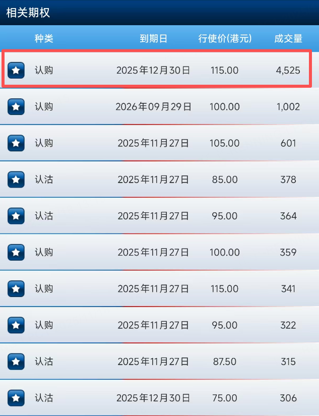 小鵬汽車的認購合約成交依然積極,佔據上午成交的前三位。成交量排名第一的是一張年末到期的CALL,行權價高達115港元,較現價有30%以上的漲幅空間。