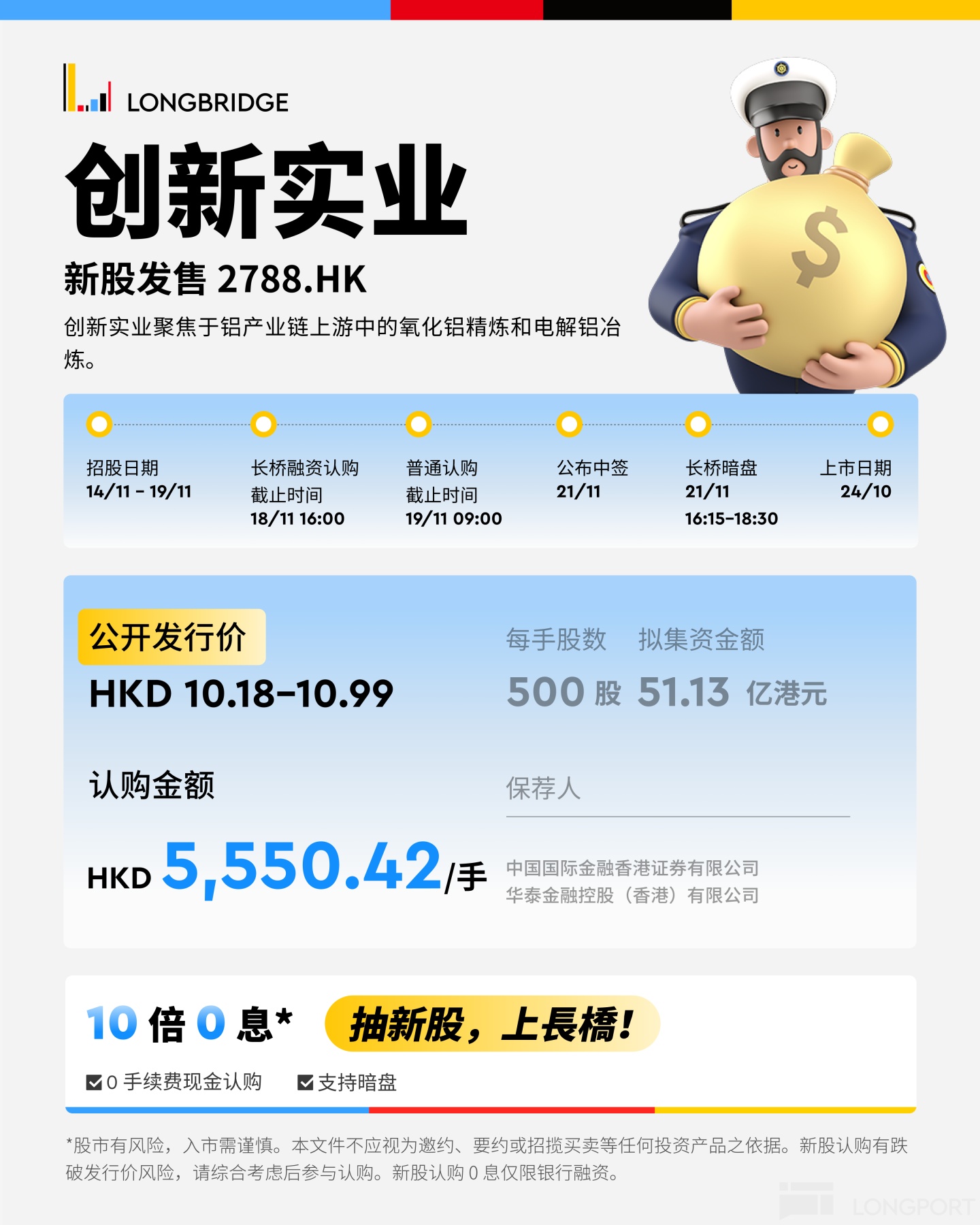 $創新實業(02788.HK) 已於 11 月 14 日正式啓動公開招股,招股期至 11 月 19 日結束,並計劃於 11 月 24 日正式在港交所主板掛牌上市。