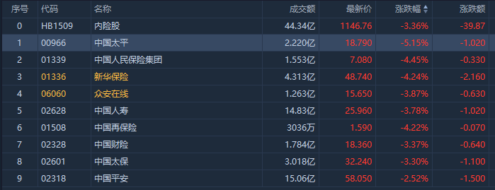 華盛資訊11月18日訊,內險股集體走低,截至發稿,中國太平跌超5%、中國人民保險集團、新華保險、中國再保險跌超4%、衆安在線、中國人壽跌近4%。