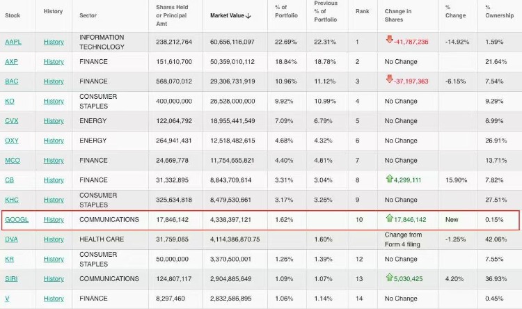 巴菲特旗下伯克希爾罕見出手科技!建倉谷歌超43億美元,直接買進十大重倉