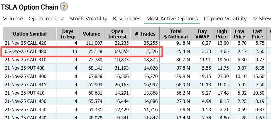 期權方面,特斯拉的前十大成交中CALL單佔據絕對優勢。一份12月5日到期的合約,行權價高達480美元,超過了今年的最高位,較現價有近20%的漲幅空間。