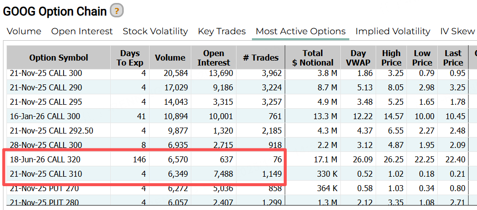 週一谷歌認購合約成交積極,佔據了榜單的前八位。其中一份本週五到期的合約行權價310美元,一份明年6月18日到期的合約行權價達320美元。在泡沫質疑越來越強烈的大背景下,谷歌會走出一波連創新高的行情嗎?