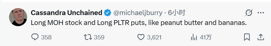 電影《大空頭》原型、成功押注美國房地產市場崩盤的投資大佬Michael Burry今日又在社交平臺發帖披露他的投資策略,他寫道:“做多 Molina Healthcare Inc 股票和做多 Palantir Technologies Inc. 看跌期權,就像花生醬配香蕉一樣絕配。”