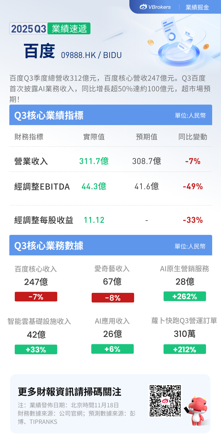 華盛資訊11月18日消息,百度 $09888.HK / $BIDU 今日公佈截至2025年9月30日止的三季度業績。