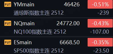 11月18日,美股三大股指期貨齊跌,截止發稿,道指期貨跌0.51%,納指期貨跌0.43%,標普500指數期貨跌0.35%。