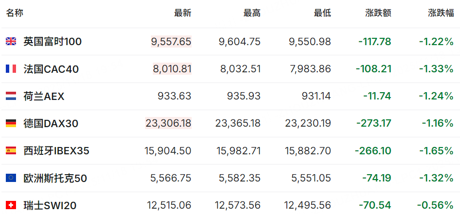 歐洲主要股指全線下跌,截至發稿,英國富時100跌1.22%,法國CAC40跌1.33%,德國DAX30指數跌1.16%。