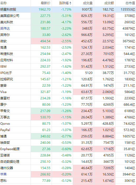 華盛資訊11月18日訊,明星科技股跌幅擴大!AMD跌超5%,美光科技跌超4%,英偉達跌超3%,英特爾、微軟、高通跌超2%,博通、甲骨文跌約1%。