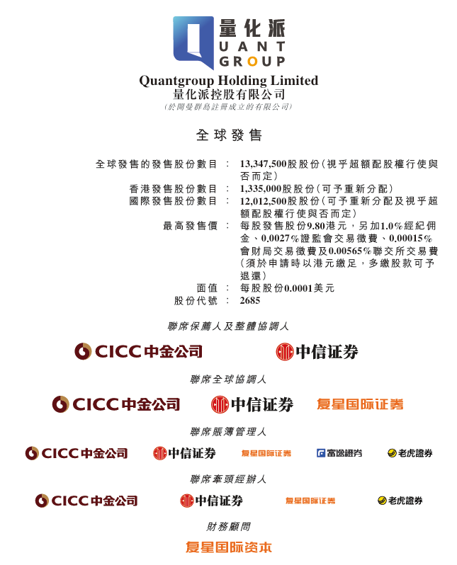 華盛資訊11月19日訊,量化派(02685.HK)今起招股,發售價區間爲8.8-9.8港元,每手500股,一手入場費4949.42港元,預期H股將於2025年11月27日(星期四)上午九時正在聯交所開始買賣。