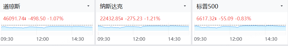 截至收盤,道瓊斯指數跌1.07%,報46,091.74點;標普500指數跌0.83%,報6,617.32點;納斯達克指數跌1.21%,報22,432.85點。