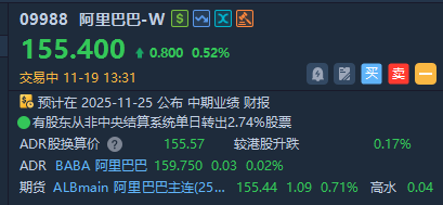 華盛資訊11月19日訊,阿里巴巴午後漲幅收窄,截至發稿,阿里巴巴漲0.52%。