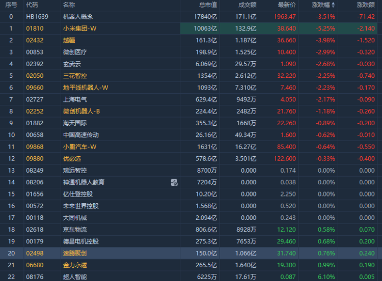 華盛資訊11月19日訊,機器人概念股走勢分化,截至發稿,越疆跌近4%,三花智控、地平線機器人-W跌超2%,優必選跌0.33%,速騰聚創跌漲0.76%。