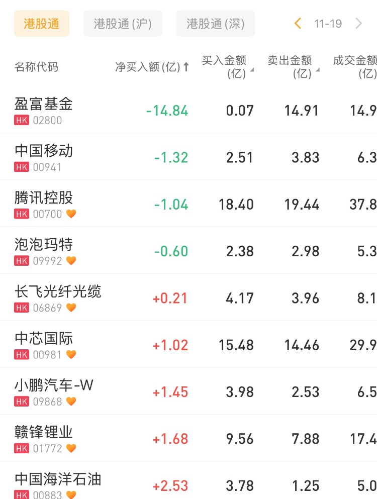 盈富基金、中國移動、騰訊控股分別遭淨賣出14.84億港元、1.32億港元、1.04億港元。
