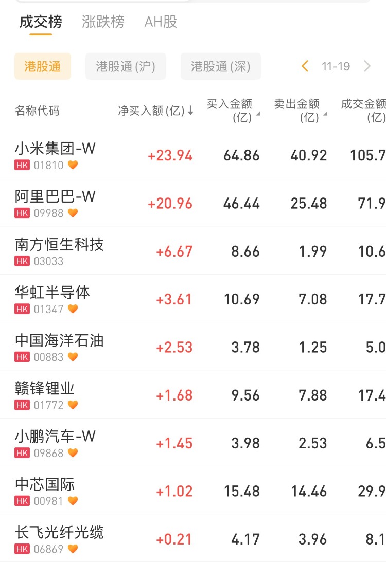 小米集團-W、阿里巴巴-W、南方恒生科技分別獲淨買入23.94億港元、20.96億港元、6.67億港元。